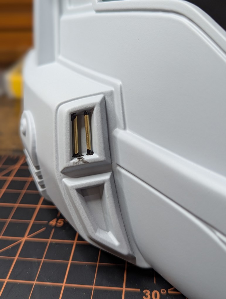 I wanted to incorporate a little bit more detail into the recessed areas on the side of the helmet. I measured the opening, cut some brass rods down to size, and super glued them in. I also added a few flat pieces of styrene sheet into the lower cavity.