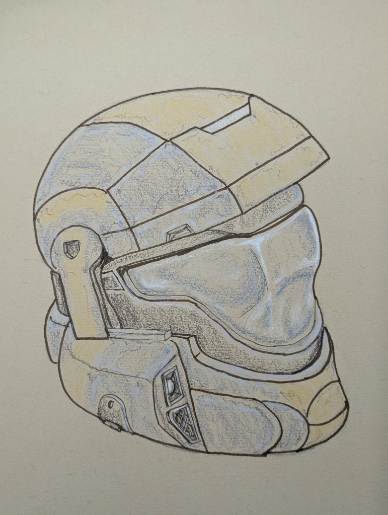 The first thing I wanted to do was some sketch work so I could understand the form of the helmet a little better and start thinking about how I wanted to do the coloration of my particular helmet. One of the interesting things about the Halo universe is that there is a lot of standardized military equipment but characters put their own touches on it, giving personality. I want to do the same with my helmet.